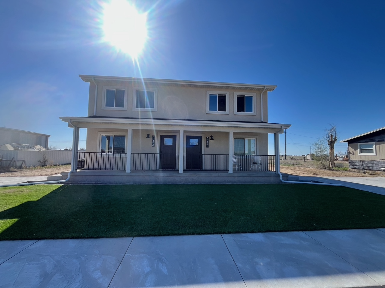 duplex building with blue sky green grass