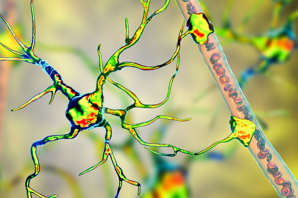 Astrocyte and blood vessel, 3D illustration.